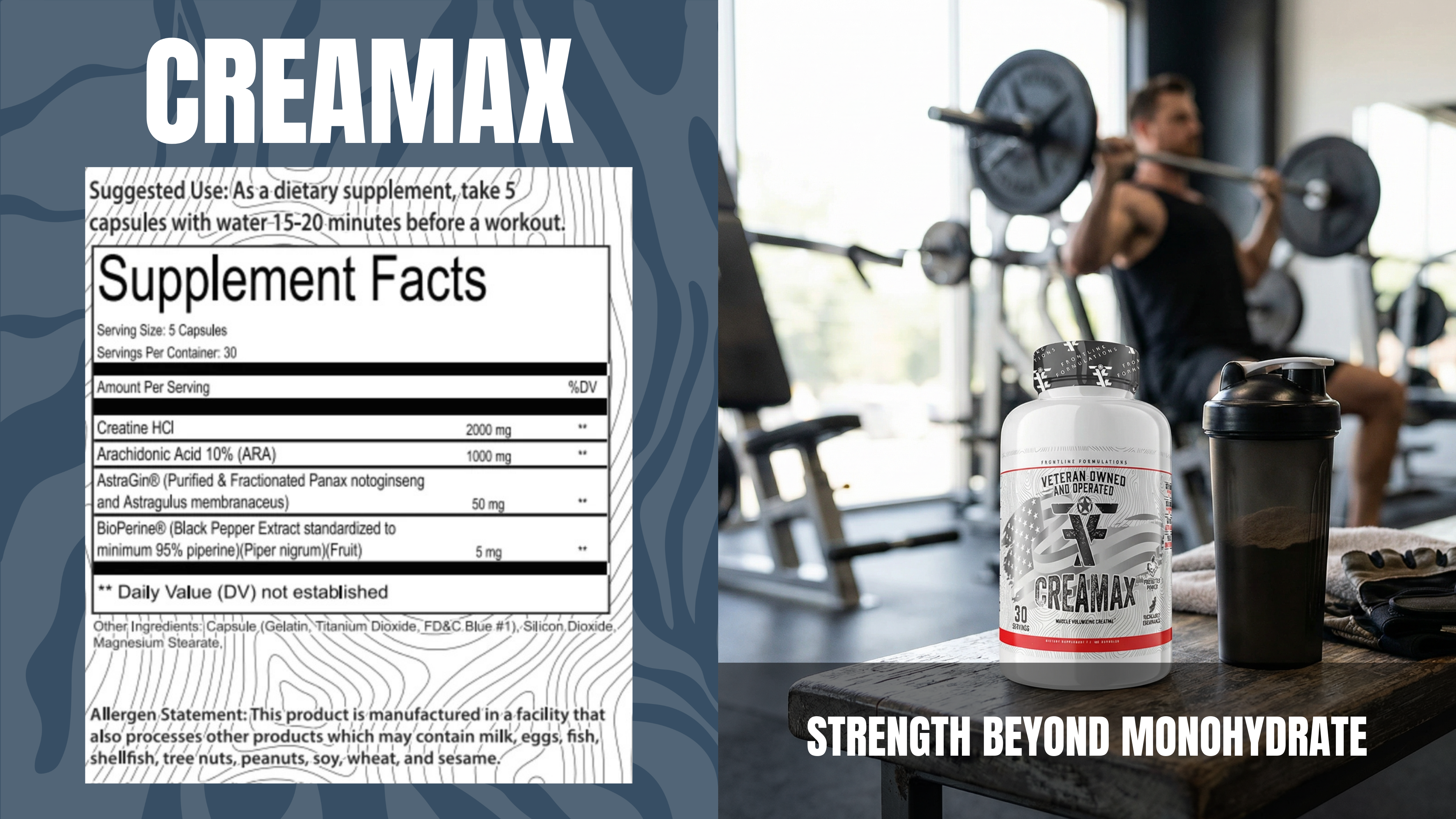 Creamax features Creatine HCl, a soluble form of creatine known for its benefits without the discomfort of bloating.