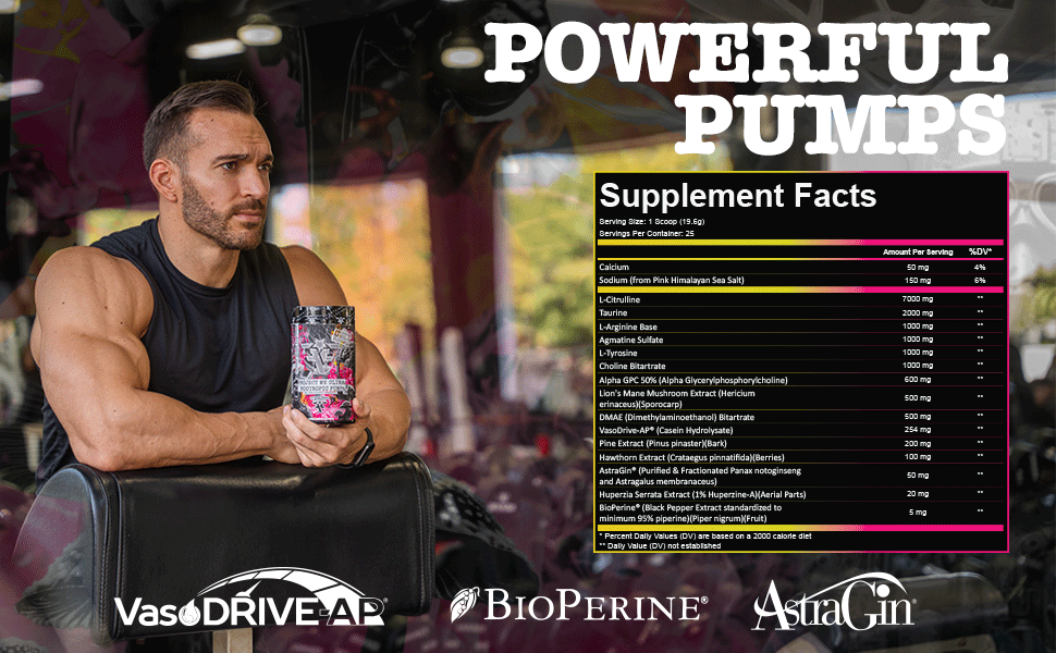 Experience skin-splitting pumps powered by L-Citrulline and Glycerol for enhanced blood flow and vascularity.